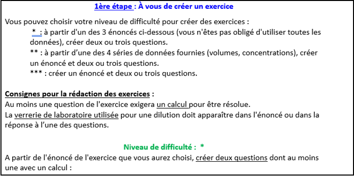 Atelier 2 « conception d’exercice » : les élèves en petit groupe conçoivent un exercice permettant de travailler les compétences calculatoires d’une dilution et ciblant un niveau de difficulté qu’il choisit. La compétence COMMUNIQUER de la démarche scientifique est alors fortement sollicitée, le vocabulaire scientifique employé et la rédaction des questions étant un objectif d’apprentissage privilégié. Les élèves doivent ensuite résoudre l’exercice proposé par un autre groupe (compétence RÉALISER) et évaluer la qualité de l’énoncé proposé (compétence ANALYSER). Les élèves doivent enfin évaluer la correction de l’exercice faite par ses pairs (compétence VALIDER).