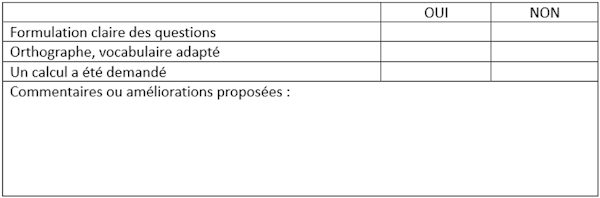 - Étape 2 : l’énoncé de l’exercice rédigé par un groupe « évaluateur » est proposé à un autre groupe. Ce dernier résout l’exercice sur une « copie » et peut faire des commentaires constructifs en s’appuyant la grille d’analyse du document « 2e étape : À vous de répondre aux questions » que le professeur fournit.